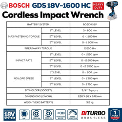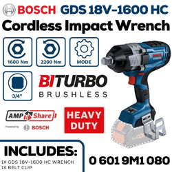 R 6,299.00 Regular price Contact for Availability Unit price /Experience exceptional cordless power with the Bosch Professional 18V Impact Wrench GDS 18V-1600 HC. Featuring advanced BITURBO Brushless technology and ProCORE18V batteries, it delivers up to 1,600 Nm tightening torque and 2,200 Nm breakaway torque for demanding tasks. The innovative Auto Bolt Release (ABR) mode enhances handling by preventing bolt or nut loss, ensuring precision and efficiency. Designed for professionals seeking maximum performance combined with cordless freedom.