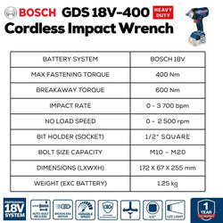 R 2,499.00 Regular price R 2,999.00 Contact for Availability Unit price /Experience unmatched power and durability with the Bosch Professional 18V Impact Wrench Kit | GDS 18V-400. Delivering a robust 400 Nm torque, it effortlessly tightens M20 bolts and 30mm nuts, making it perfect for a wide range of bolting tasks. Designed for longevity, its enhanced critical components ensure extended tool life. The innovative Auto Bolt Release (ABR) feature simplifies disassembly by automatically stopping the tool when nuts are loosened, boosting efficiency and ease of use on every job.